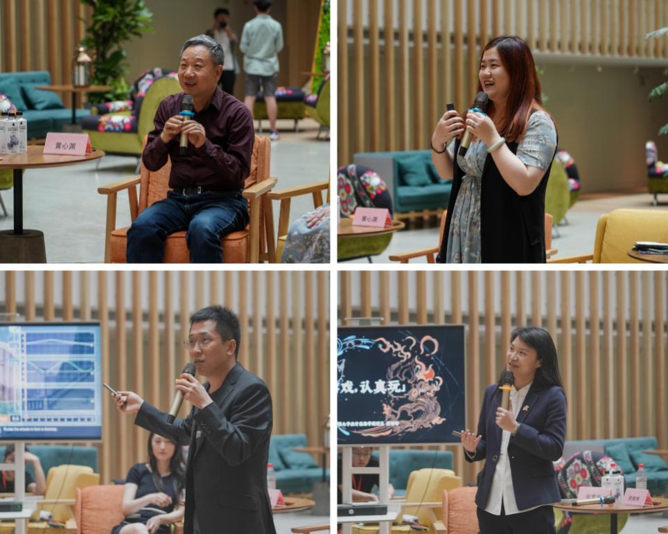 (中國傳媒大學動畫與數字藝術學院院長黃心淵、游戲系系主任張兆弓、設計思維學院院長稅琳琳、英雄體育VSPN高級制作人張雨晨在現場進行分享)