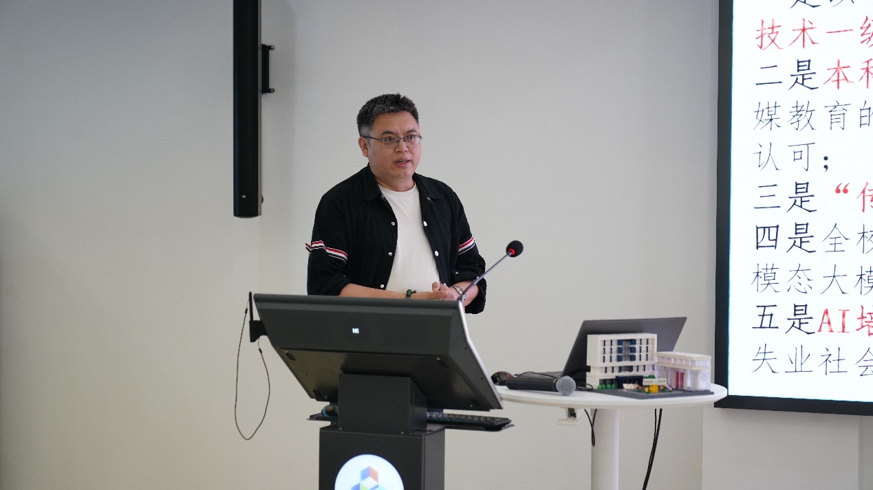 趙新利結合學院在人工智能領域的新探索、新嘗試、新布局,介紹了學院在學科專業建設、復合型人才培養、實驗室升級改造、科研、教學、行政管理等方面的實踐探索。他表示,學院將秉承“交叉融合,開門辦學”“顛覆性創新,結構性重構”的原則,發揮學業界資源平臺聚合優勢和產學協同育人特色,在“人工智能大調研”的基礎上,對品牌與智能傳播設計、計算廣告、“品牌實驗班”等專業或項目進行系統性重構,對各專業課程和教材體系進行全面改革,打造“人工智能+品牌+國際傳播”的人才培養鏈條和科研布局,積極擁抱人工智能帶來的機遇和挑戰。