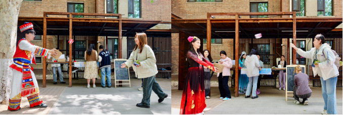 市集還設置了多個互動游戲攤位,在“山海同心”民俗挑戰營中挑戰高山族背簍投球;沉浸式體驗朝鮮族頂甕行走;在“版圖探秘·民族智慧堂”中感受趣味貼貼樂和知識擂臺賽。通過這些充滿民族特色的游戲,同學們更加深入地了解各民族文化,在潤物無聲中增進中華文化認同。