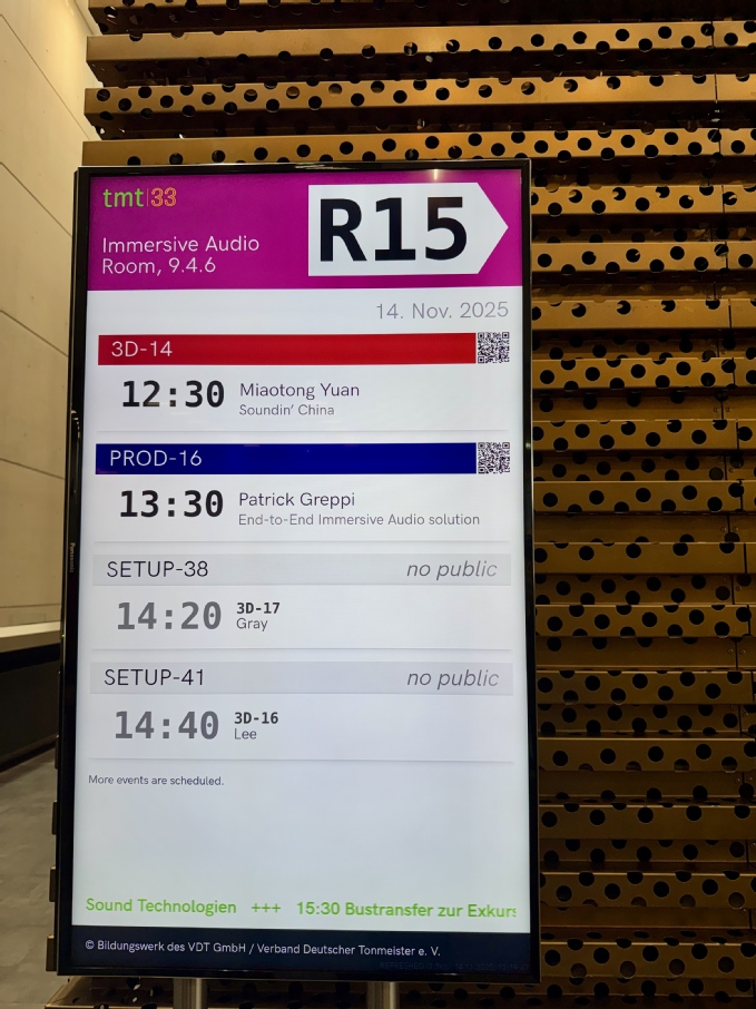 (通訊員 黃子軒 高尚 高楚涵)11月12日至15日,德國錄音師協會第33屆雙年會在杜塞爾多夫會議中心隆重舉行。中國傳媒大學音樂與錄音藝術學院袁邈桐教授成功組織了第二屆“中國之音”專場分論壇,帶領由本科生至碩士生組成的研究梯隊,通過高水平論文發表與3D音頻作品專場研討會,向世界展示了中國傳媒大學音頻技術的創新實力與國際化專業建設成果。