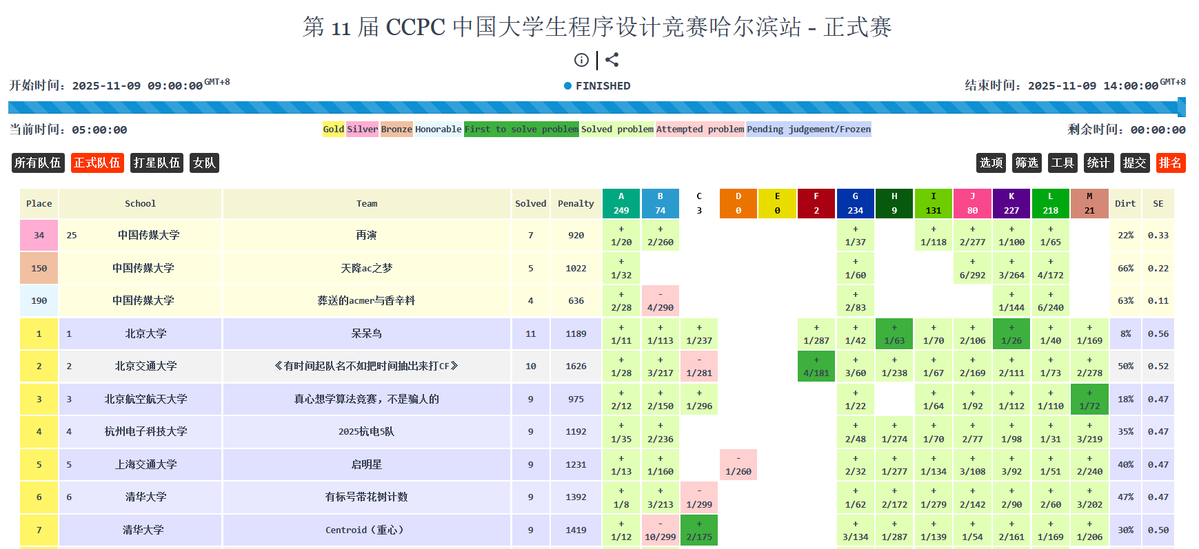 11月9日,第11屆CCPC 中國大學生程序設計競賽哈爾濱站在哈爾濱工業大學開賽,賽事吸引北京大學、清華大學、中國傳媒大學等全國168所高校的260支高校隊伍同臺競技。我校由信息與通信工程學院2023級通信工程專業陳旻庚、新聞學院2023級傳播學專業(計算傳播方向)朱霽、動畫與數字藝術學院2023級數字媒體技術專業(游戲設計方向)葉陽組成的“再演”隊憑借7道題920分鐘罰時的成績,在賽事中位列第34名,成功摘得銀牌。由信息與通信工程學院2023級人工智能專業劉鈺、數據科學與智能媒體學院2023級智能科學與技術專業范金旭、信息與通信工程學院2023級電子信息工程專業杜可組成的“天降 AC 之夢”隊以5道題的解題表現收獲銅牌,展現了沉穩的競技狀態。