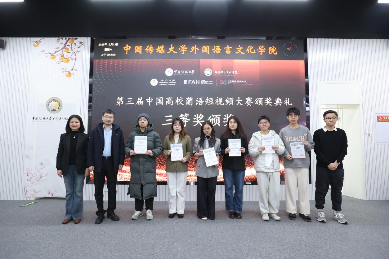 (通訊員 李昱 劉馨憶 顏巧容 攝影 林曦 宗泱泱)12月13日,第三屆中國高校葡語短視頻大賽頒獎典禮暨“科創新‘視’界·青年傳新聲”主題交流會在中國傳媒大學外國語言文化學院舉行。本屆大賽以“科創中國”為主題,共收到來自內地及澳門29所高校的64部參賽作品,經評選產生15部獲獎作品。活動為青年學子與業界專家搭建了對話平臺,共同探索面向葡語國家的有效傳播路徑。
